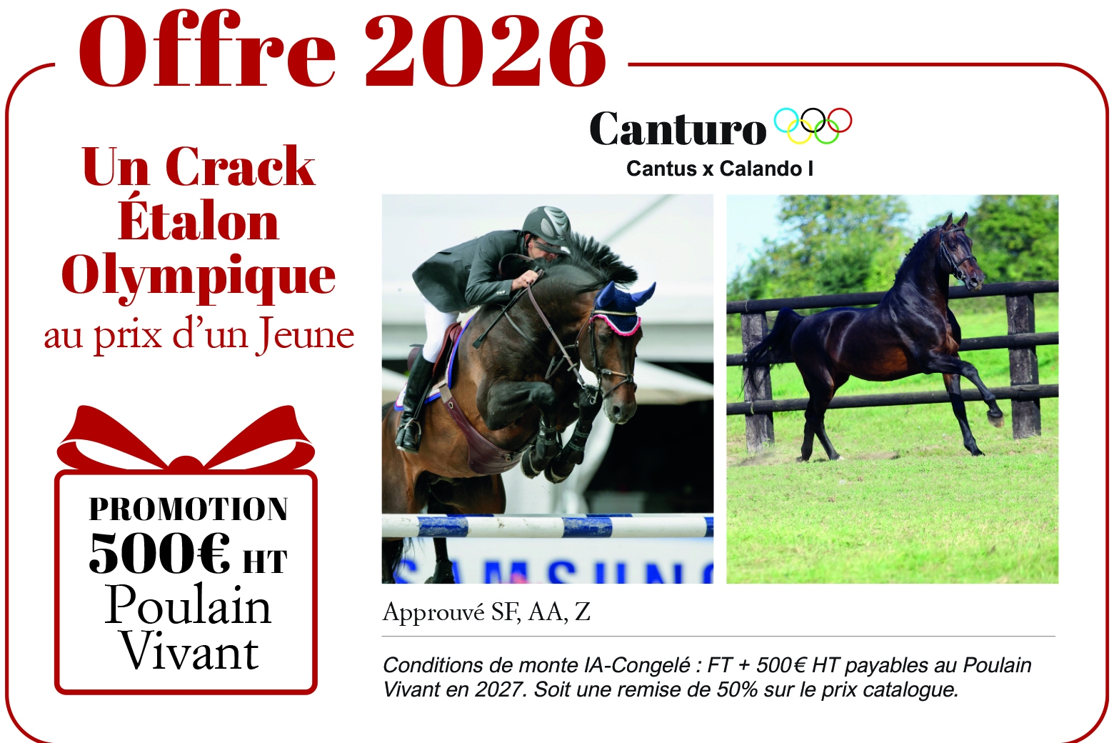 Conditions de monte en semence congelée: FT + 500 € HT payables au Poulain Vivant en 2027. Soit une remise de 50% sur le prix catalogue!